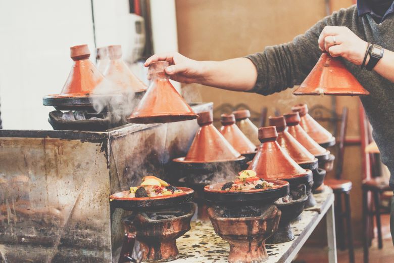 במטבח המרוקאי משתמשים בטג’ין לבישול ארוך של ירקות עם בשר וקוסקוס, כאשר בכל מקום סוג הירקות שונה לפי מה שגדל באזור. חוץ מהטג’ין נראה פה גם הרבה בשר על האש (בעיקר כבש). היום כמובן יש גם מסעדות מערביות, שנפתחו על ידי דור חדש של שפים, שעושים אוכל אותנטי עם טוויסט. שתיית אלכוהול אסורה במסעדות ומותרת רק במלונות.